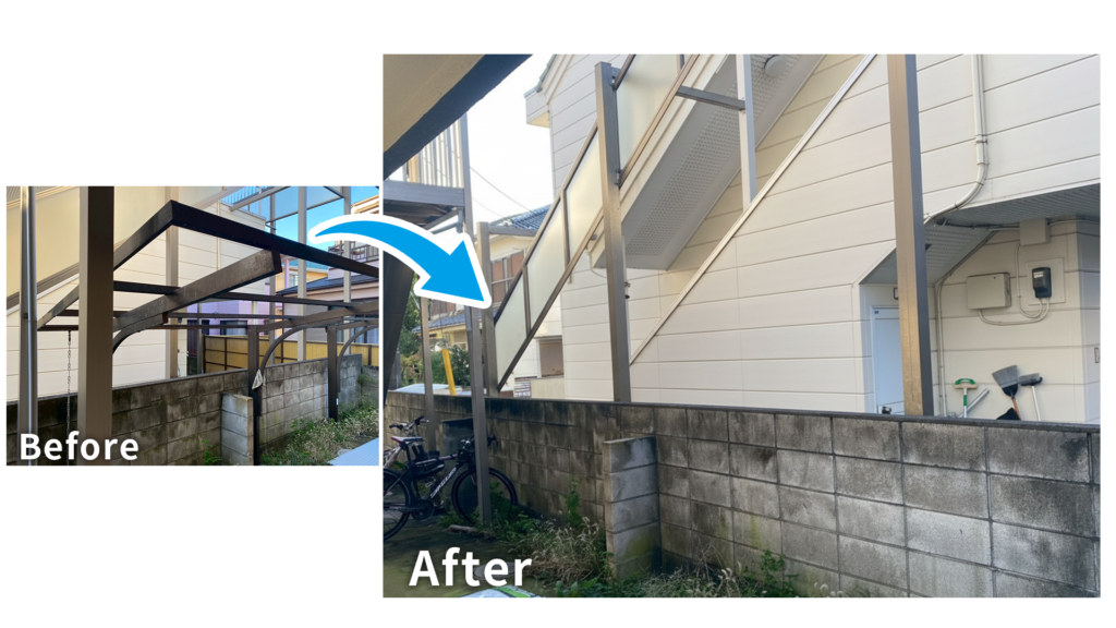 固着したボルトの対応や養生、搬出経路の確保、近隣への配慮まで含めてスムーズに進められるため、短時間で「危険がなくなる・見た目がスッキリする・スペースが使える」状態に整えられます。